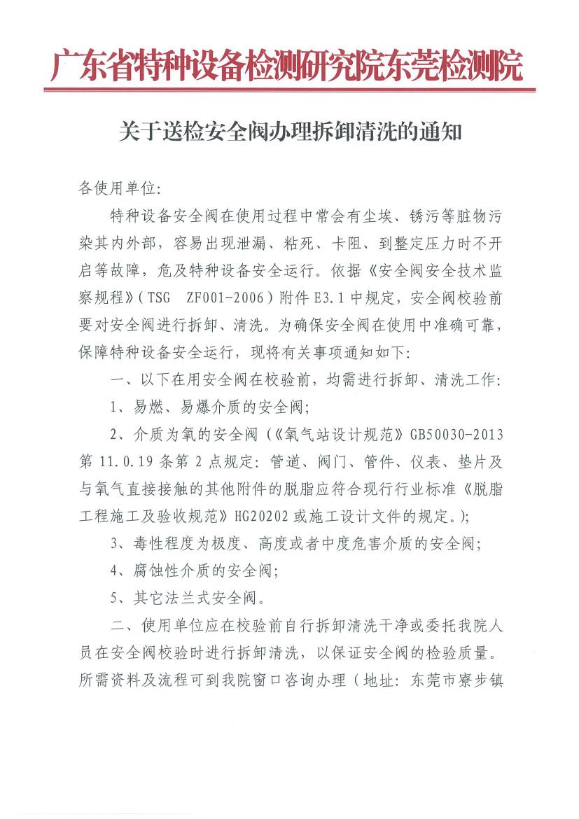 東莞特檢院關(guān)于送檢安全閥辦理拆卸清洗的通知
